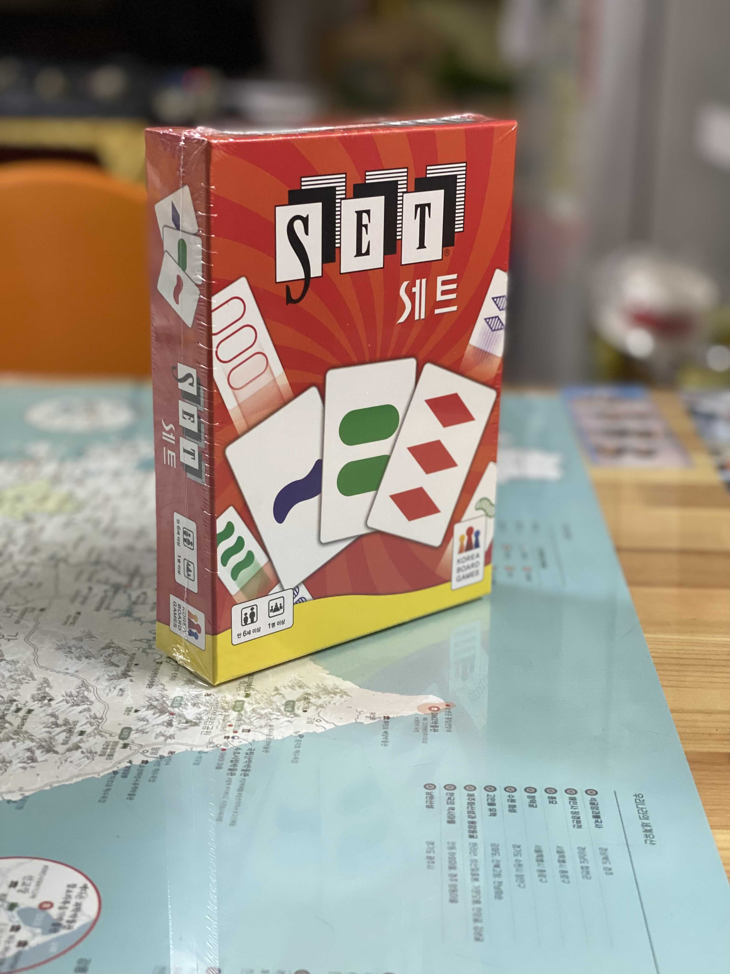 세트는 혼자서도 하고 인원에 거의 제한이 없는 게임이다. 이 게임은 멘사셀렉트라고 멘사에서 선정하는 게임 (약간 두뇌 계발에 좋은)이고 출시된지도 꽤나 오래되어서 보드게임을 접한지 오래되지 않은 사람들도 빠른시간내에 플레이해보게 될 게임중에 하나라고 할 수 있다. 그런데 사실 개인적으로는 카드에 그림들이 너무 단순하고 예쁘지 않아서 그 동안 구입도 안하고 플레이도 안해보았는데, 아이들에게 경험시켜주면 좋겠다는 생각이 들어 얼마전(2주 정도 전?)에 구입하여 플레이 했다. 룰은 12장을 펼쳐놓고 도형의 4가지 조건에 맞는 3장의 카드 셋트를 빨리 찾아내고 세트를 외친 후 그 카드 셋트를 다른 사람들에게 공시하고 가져가는 것이 게임의 방법이다 (물론 세트를 외쳤는데, 셋트가 안되면 이미 획득했던 셋트를 반납해야 한다) 파티게임으로 분위기를 띄우기에는 약간의 브레인 버닝이 있어서 셋트를 외치는데 딜레이가 발생하여, 플레이중에 왁자지껄해지지는 않는다. 아무래도 조용한 분위기에서 여러명이 가볍게 플레이하기 좋은 게임으로 특히 소수의 인원보다는 4~5명 정도가 진행을 하고, 너무 잘하는 사람에게 약간의 패널티를 주면서 밸런스 조절을 해가며 플레이 하면 좋다.