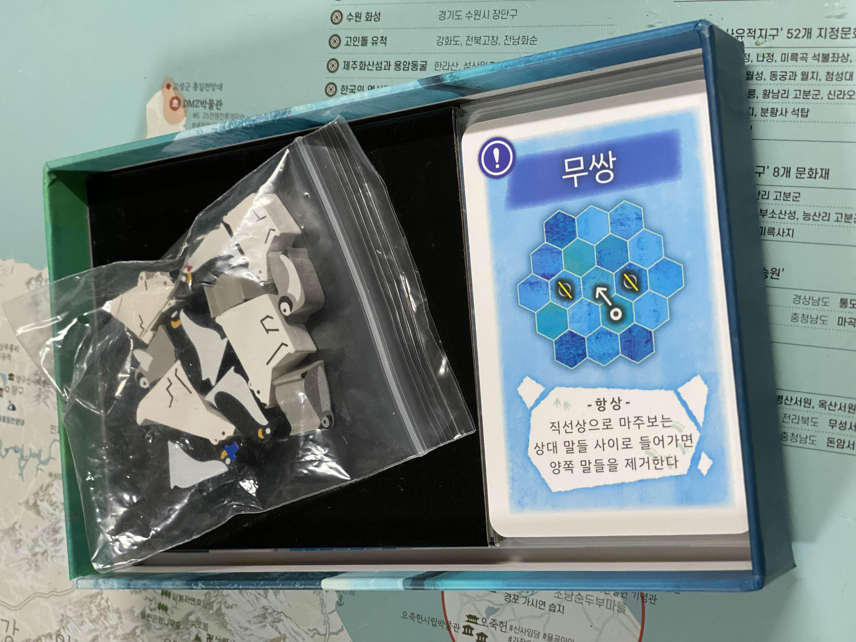 펭귄과 북극곰은 서로 다른 방식으로 작동하며, 각 진영마다 고유한 능력 조합이 존재한다. 덕분에 두 플레이어는 똑같은 방식으로 플레이하지 않으며, 한 번 게임을 끝낸 뒤 역할을 바꿔 재도전하게 만드는 리플레이 욕구를 자극한다. 컴포넌트는 단순하고 구성도 소박하지만, 턴마다 변화하는 능력과 토큰 간의 위치 관계가 만들어내는 전략적 변수는 결코 가볍지 않으며 짧은 시간 안에 긴 호흡의 싸움을 경험할 수 있다. 도쓰카 주오의 게임은 룰북을 읽을 때부터 직관적인 아이콘과 레이아웃으로 구성되어 있어 몰입감을 주는데, The Arctic 역시 작가 특유의 미니멀함과 정제된 설계가 잘 드러나는 작품이다.