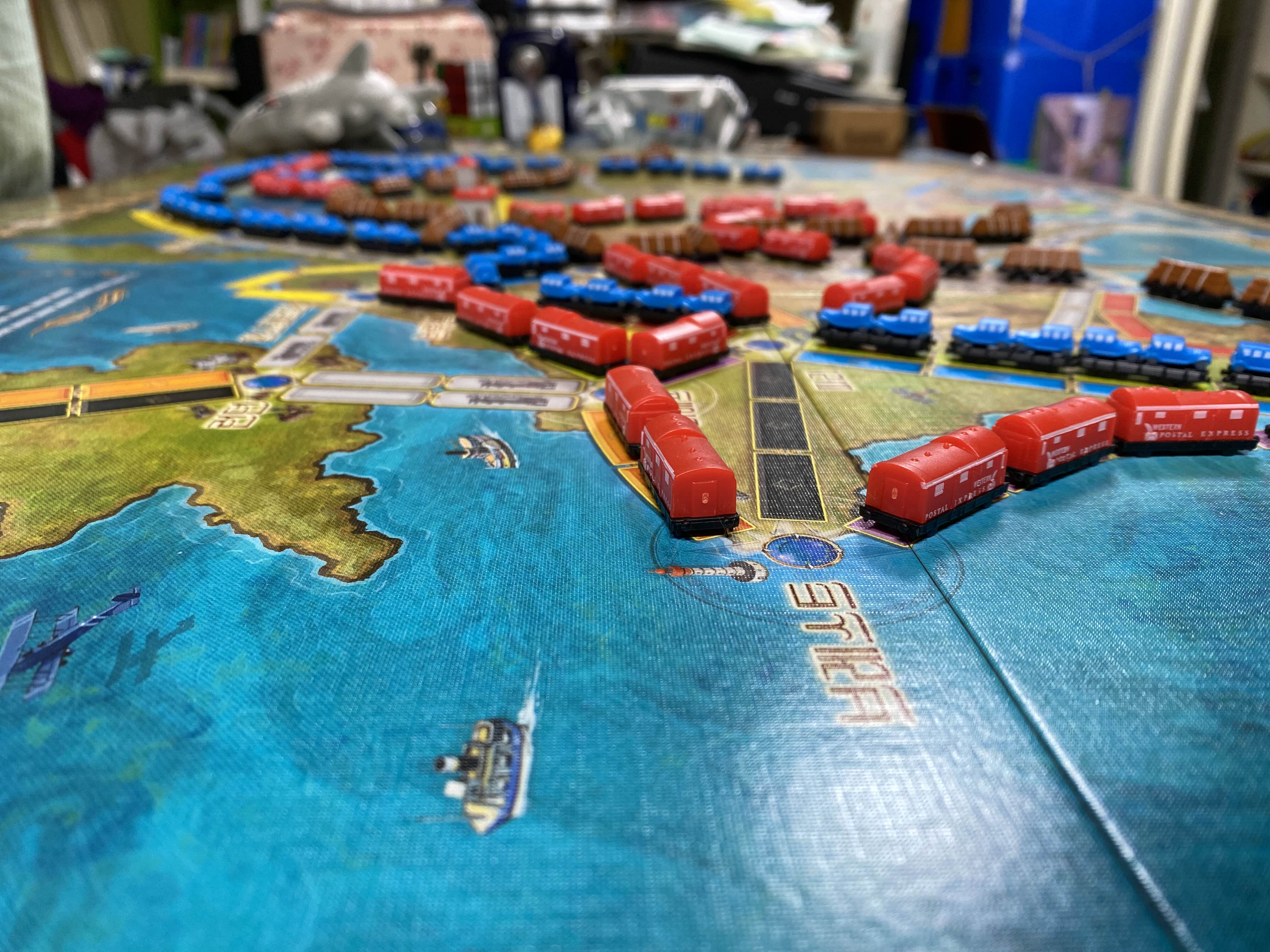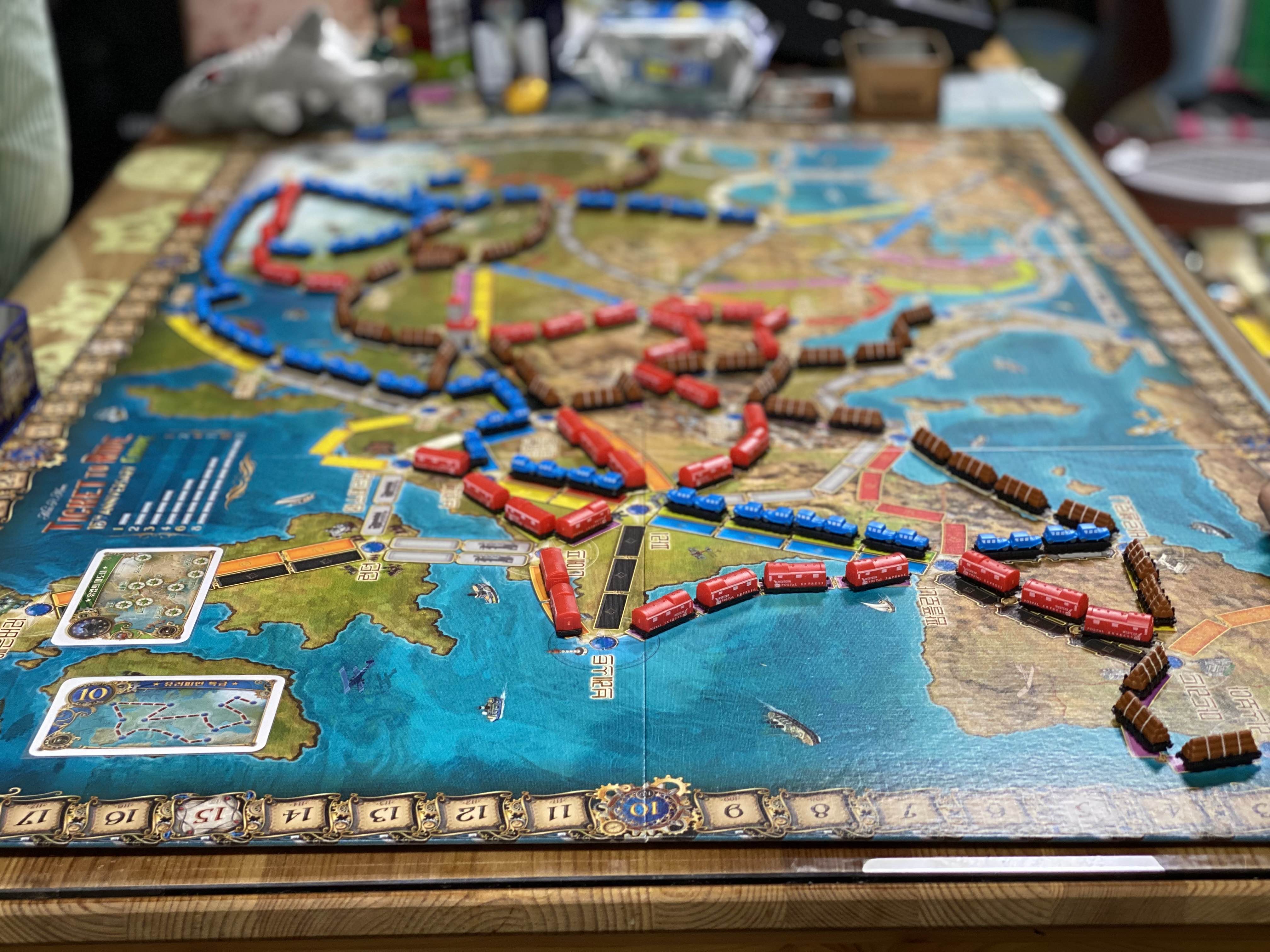 티켓 투 라이드는 큰 보드판으로 인해 매우 오래 전 게임 같지만, 실제로는 아직 출시한지 20년도 안된 게임이다. 부루마블이 40년, 모노폴리가 90년 가까이 된 것을 생각하면... 본 게임은 티켓 투 라이드 유럽 15주년 기념판인데, 일반판과의 차이는 큰 보드판, 채색된 미니어쳐와 틴캔이 전부이다. (물론 이 전부인 것 때문에 이 기념판들을 많이 산다). 아, 물론 가격도 차이가 난다(일반판의 3배 정도...). 티켓 투 라이드는 게임 시작시 받은 목표카드의 목표(경로)를 달성하기 위해 카드를 모아서 그 목표를 달성하여 점수가 가장 높은 사람이 이기는 게임이다. 이 와중에 상대방과 비슷한 트랙을 선점해야 하는 경우가 생겨 자신의 경로를 급하게 수정해야 하거나, 상대방의 경로를 방해해야 하는 일이 생기는데, 이런 부분이 완전히 운으로 결정되지는 않는 것이 꽤나 재미요소이다. 공간을 점유하며 진행하는 게임이다 보니 인원수에 따라 게임의 양상이 매우 다르게 진행된다. 예를 들어 2인의 경우는 각자 진행하는 게임에 가깝게 진행되어 심시티 같은 느낌으로 진행되고, 3인이 되면 약간의 간섭이 발생하며, 4인, 5인이 되면 상호작용이 많이 발생함으로 민감한 사람은 서로 마음 상할 수도 있다.