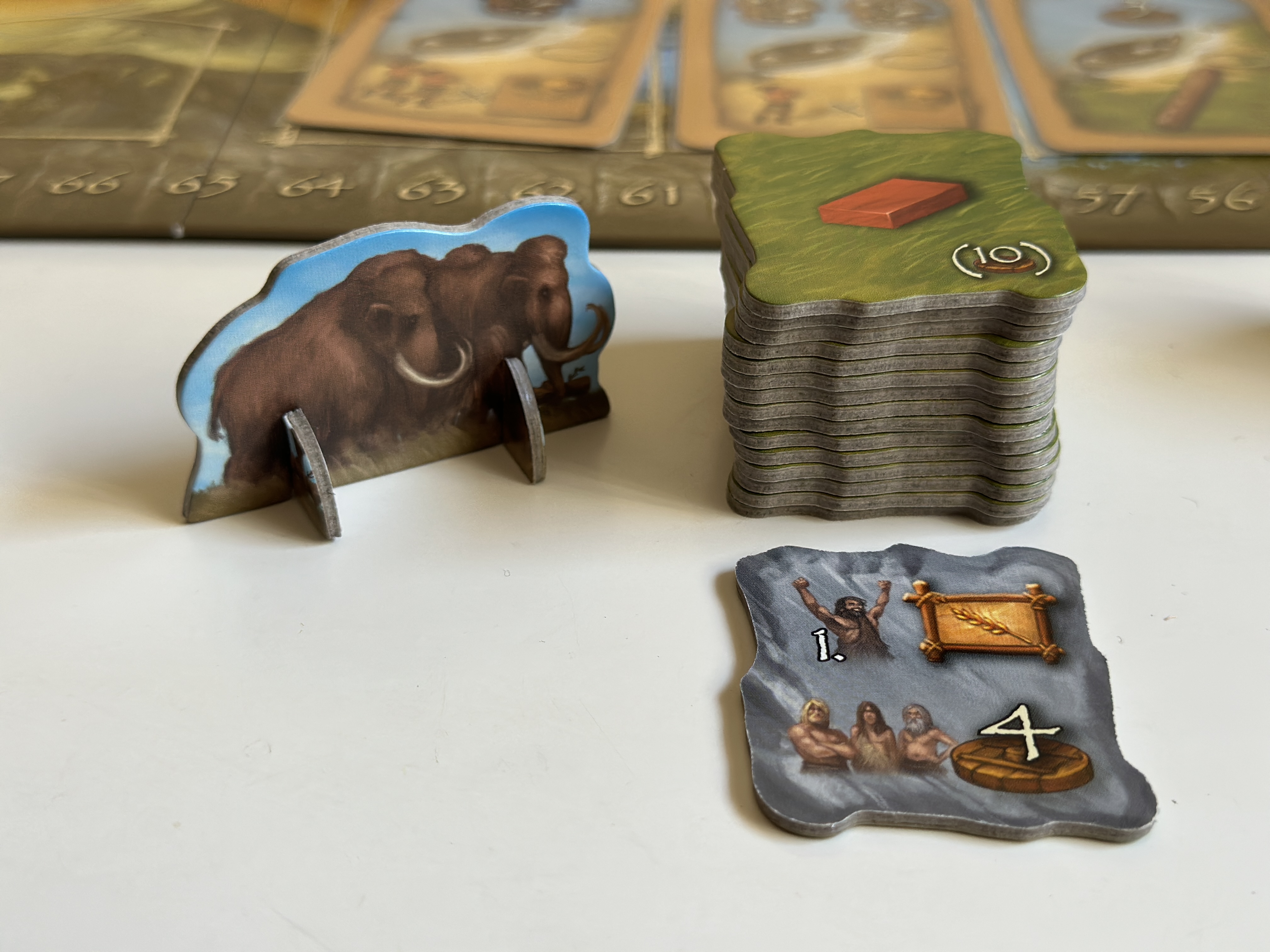 게임을 시작하면 섞어 뒷면으로 쌓아둔 타일(자원 그림만 덩그러니 있는 면이 뒷면이다)의 자원 수집처에 매머드 무리를 놔둔다. 그곳에 매머드 무리가 나타난 것으로 그쪽에 일꾼을 보내면, 주사위를 굴려 자원을 획득하는 하고나서 매머드 무리 쪽으로 바로 이동하여 행동을 하게 된다. (테마상으로는 매머드 무리지만... 사실은 일종의 도박장 마차가 열린....) 이동하려면 일꾼 하나당 식량1개를 내야 하고 (돈 놓고...) 이동을 시켜놓고 나서, 라운드가 끝날때 매머드를 길들인다(도박에 참여....). 우선 타일을 하나 뒤집고 (위의 사진에서 아래 놓여진 타일 처럼) 참여하는 플레이어는 모두 자신의 일꾼 수 만큼(식량을 낸.. 식량을 안낸 일꾼은 마을로 돌아간다) 주사위를 선택해 굴린다. 모든 플레이어가 굴렸다면 가장 높은 숫자가 나온 플레이어는 타일의 위에 표시된 보너스(사진에서는 식량 생산량 표시에서 자기 표시 말의 위치를 1칸 위로 올림)를 먹고 타일을 가져가서 뒷면으로 놓고, 나머지는 아래 보너스(4점을 얻는다)를 얻는다. 이 타일은 나중에 점수로 계산되는데, 타일 하나하나가 점수가 아니고... 타일 갯수를 플레이어끼리 비교해서, 가장 많이 가진 사람이 10점을 얻는다.