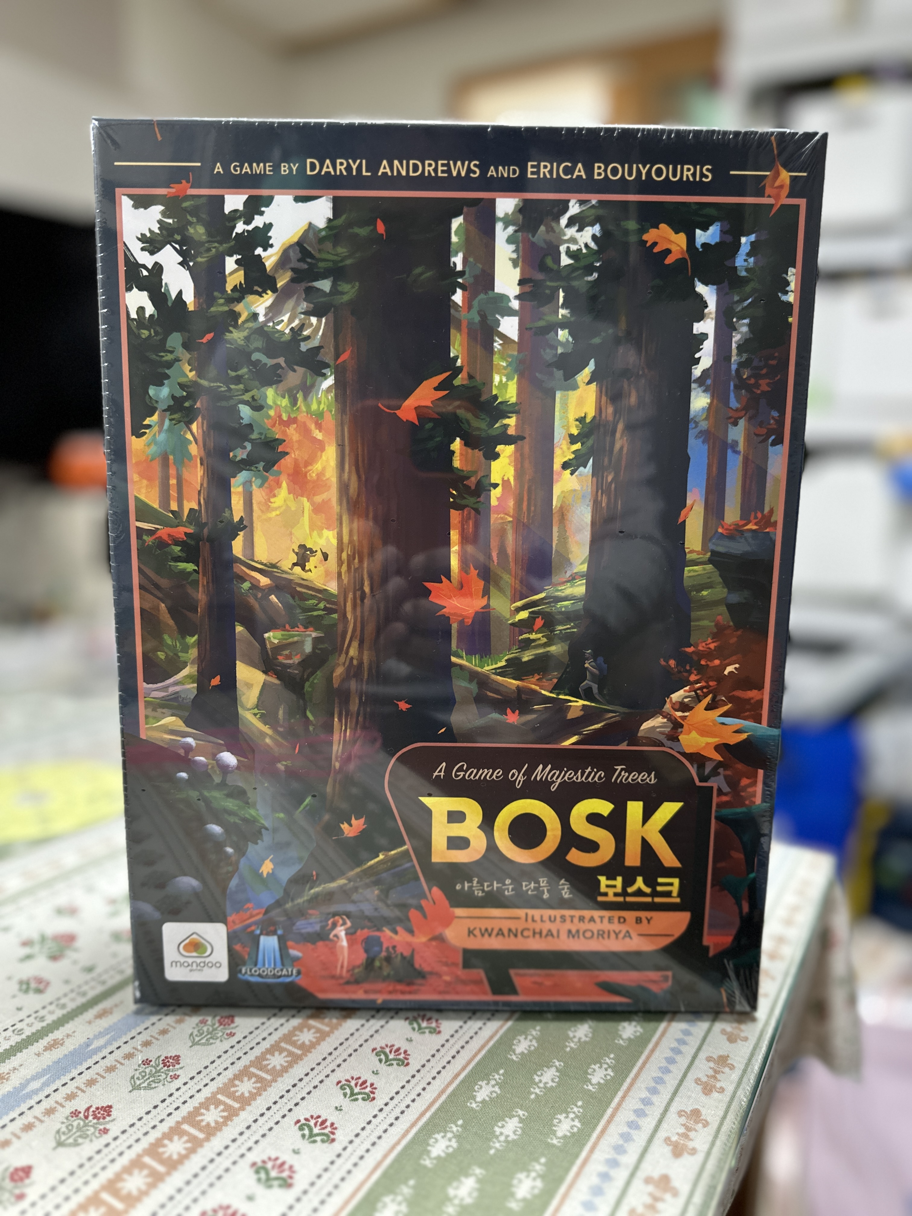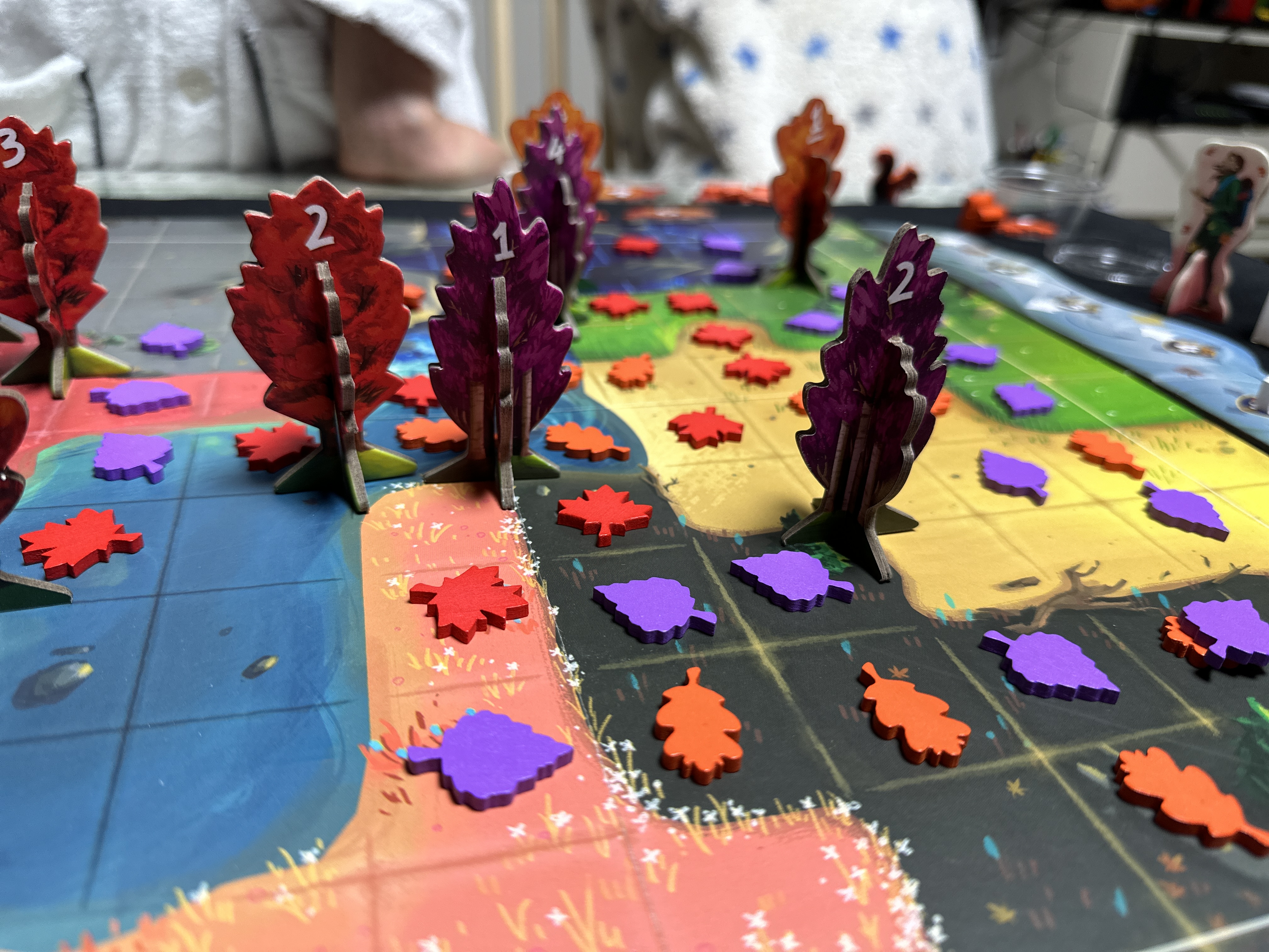 구입하고 근 3년(햇수로 4년...)만에 플레이를 했는데, 사실 당시에 플레이 모습이 너무 이뻐서 구입했었다. 하지만 주제가 주제인 만큼 아무래도 잔잔하게 진행될 것 같고 영향력 게임들이 그렇듯이, 약간 직관적이지 않아 어린이들과 하기엔 어려울 듯 해서 미루고 있었다. 여튼 플레이 결과로는 확실히 이쁘다. 뭔가 플레이가 일어나는 느낌도 매우 좋고, 왠지 플레이어가 숲의 정령이 된 느낌도 들고, 개인적으로는 매우 만족스러운 게임이었다. 이 게임의 진행방식은 1년간의 사이클 동안 게임이 진행되는데, 봄에 나무를 잘 심고(포지션 선점), 여름에 1차 점수를 얻고, 가을에 변화하는 바람의 방향에 따라 낙엽을 잘 퍼트려, 겨울에 나의 낙엽이 각 지역에 가장 많이 펼쳐지도록 하여 2차 점수를 얻는 게임이다.