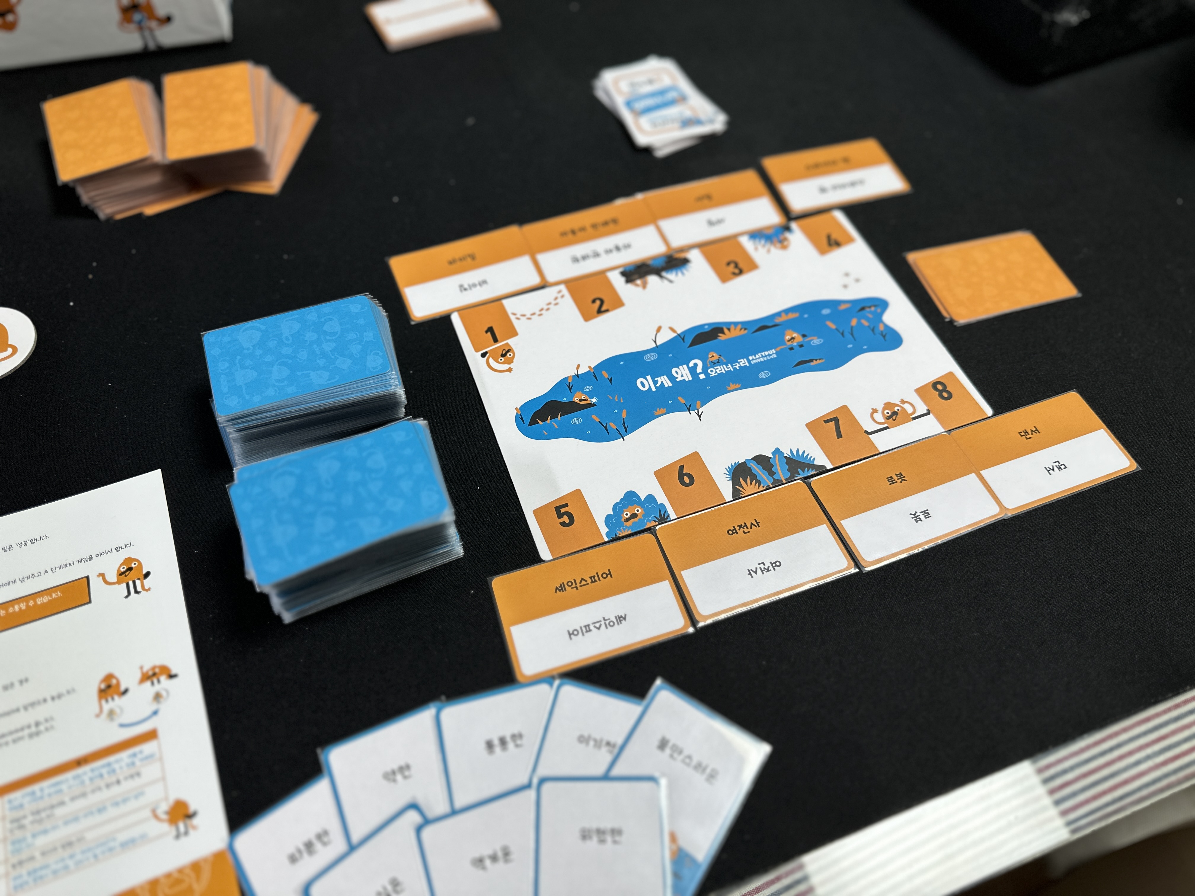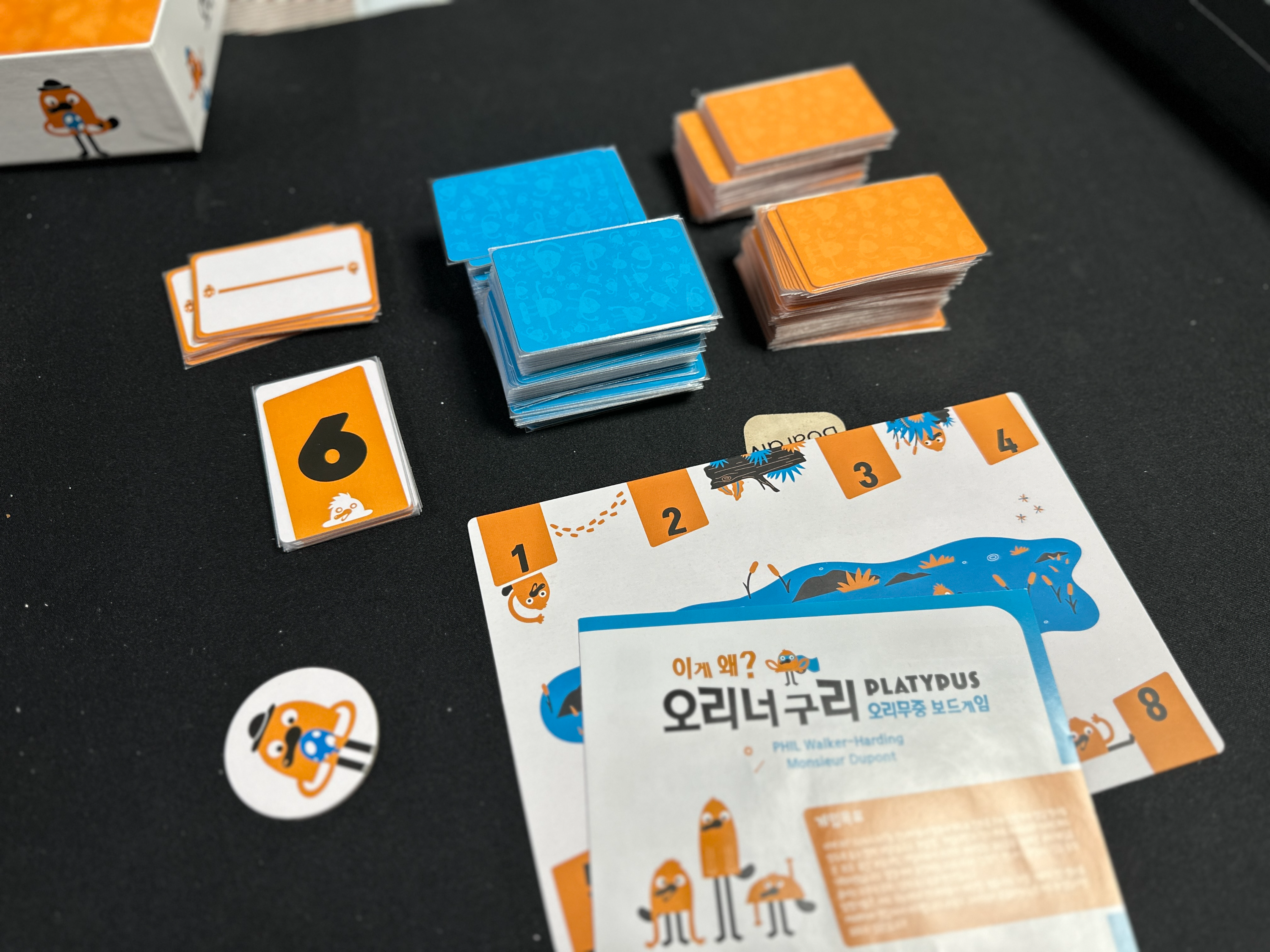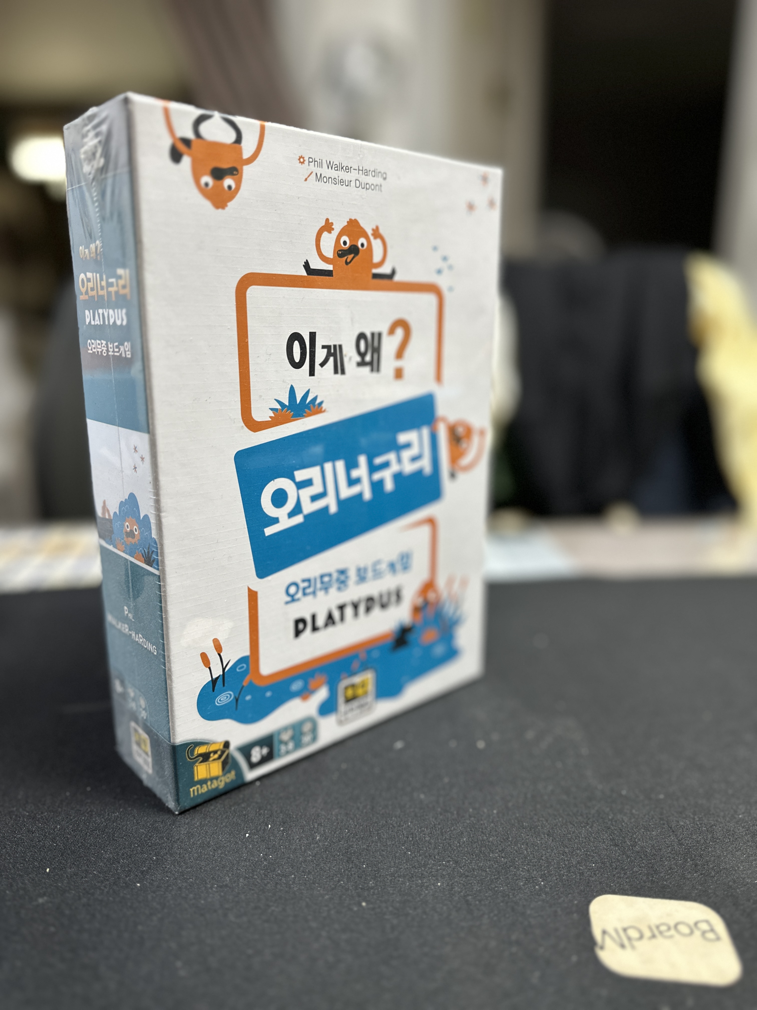 『이게 왜? 오리너구리』는 영어 원제가 『Platypus』(2021)인 게임으로 언어 기반 파티게임이다. 게임 제목이 ‘platypus 오리너구리’인 이유는 게임의 개발자들이 호주 사람들로, 호주를 상징할 수 있는 것을 최대한 활용하였다는 것이라 한다. 퍼블리셔에서 이 이름을 어떻게든 살려보려고 『이게 왜? 오리너구리』 라고 고민해서 지었다고 하는데... 이 제목이 왜 『이게 왜? 오리너구리』인지는 알수가 없다. 아마 애초에 이름을 지을 때 이 생물이 가진 이질적이고 모순적인 특성 때문이다. 포유류이면서 알을 낳고, 오리의 부리와 수달의 발, 비버의 꼬리를 모두 갖춘 오리너구리는 ‘무엇인지 알 수 없는 것’의 상징이다보니, 이 게임도 정체를 알 수 없는 어떤 단어를, 제한된 형용사 힌트들로 정의하고 추리하는 것, 그 자체가 오리너구리처럼 혼란스럽고 재밌는 경험을 만들기 때문이 아닐까? 라는 생각을 해본다.