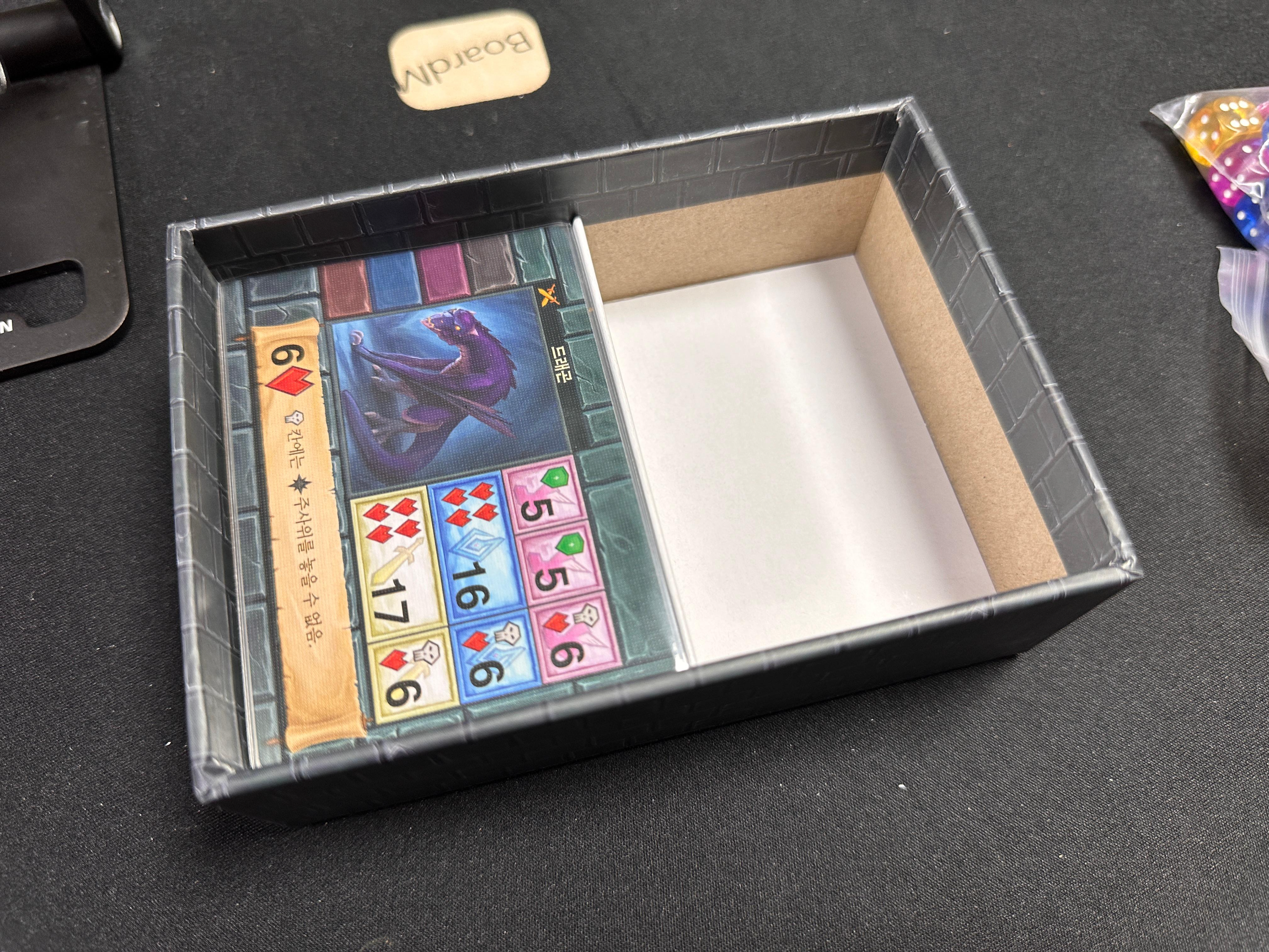 게임을 보관할 때 참고할 수 있는 사항으로 가운데 디바이더를 중심으로 좌우 공간의 크기가 약간 다르다. 한쪽은 카드가 맞는데, 한쪽은 카드가 들어가기에 약간 좁기 때문에, 잘 보고 넣어야 한다.