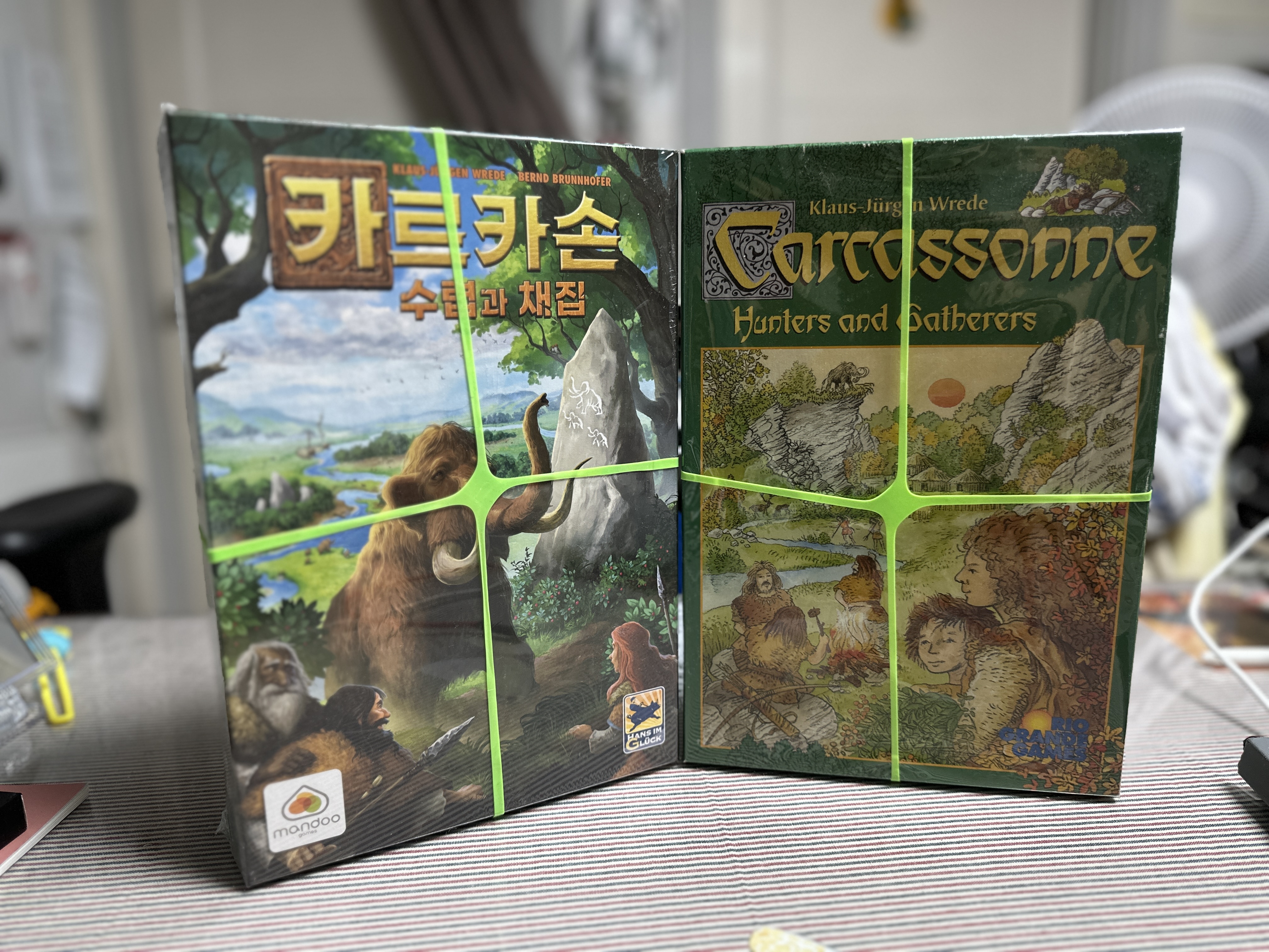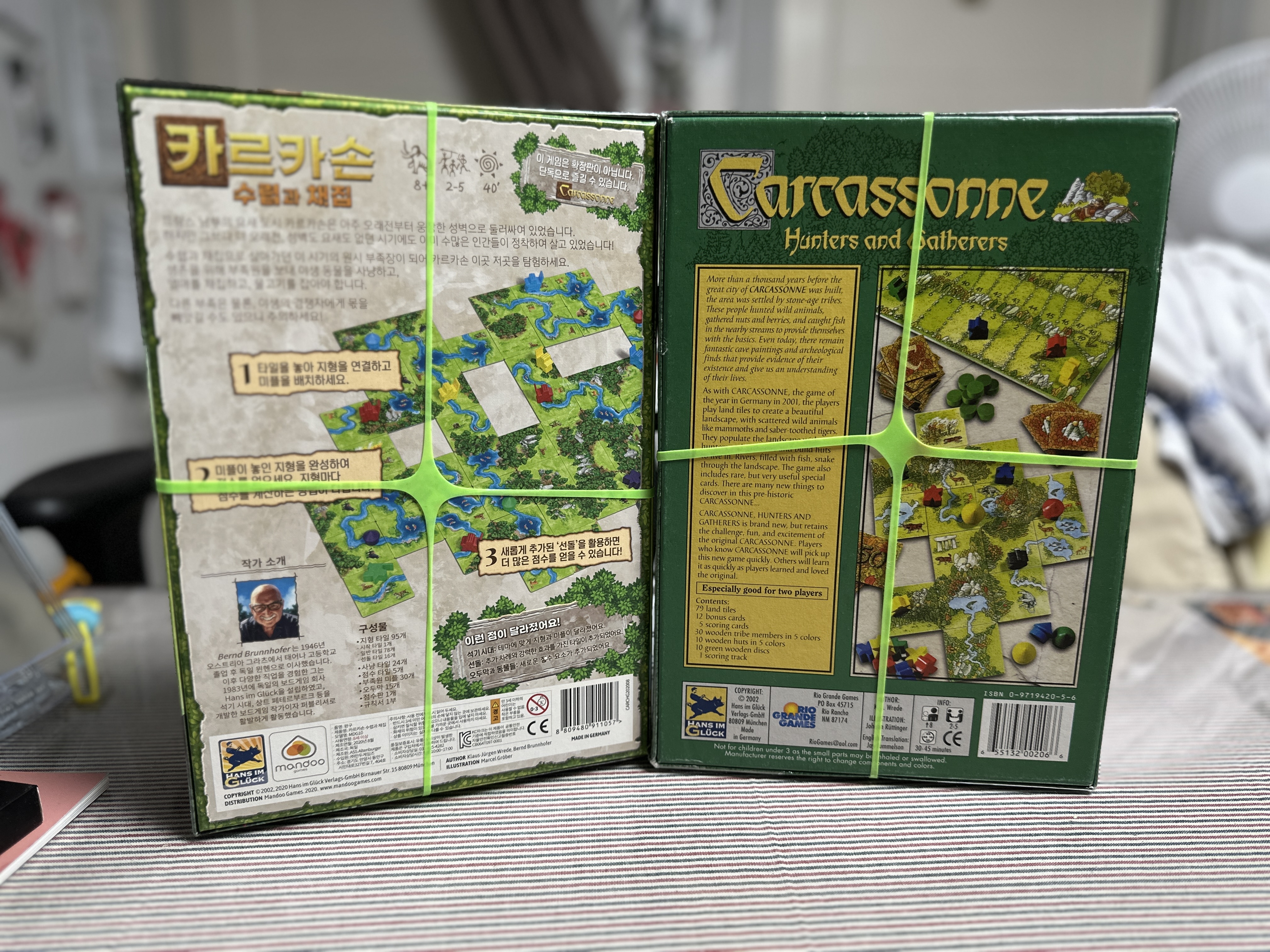 ‘카르카손: 수렵과 채집(Carcassonne: Hunters and Gatherers)’는 타일 놓기 게임의 대표작 ‘카르카손’의 독립형 변형 작품으로, 중세 시대를 배경으로 한 원작 대신 선사시대의 자연 환경 속에서 수렵과 채집으로 생존하는 테마를 채택한 점이 가장 큰 특징이다. 2008년에 출시되었을 초에는 한글판이 없어서 영문판이나 독일판을 구해야 했지만, 언어요소가 전혀 없어서 플레이하는데 전혀 지장이 없었던 게임이다. 2020년에 만두게임즈에서 한글판을 출시했다. 현재는 여러군데에서 2만원 대의 매우 저렴한 가격으로 구입이 가능하다. 의외로 미플((나의)사람모양 말)이라는 용어가 카르카손으로 부터 유래하게 되었는데, Meeple”(미플)이라는 용어는 2000년 11월, 미국의 보드게임 플레이어 Alison Hansel이 “my people”라는 표현을 “meeple”로 잘못 발음하면서 이 단어가 탄생한 것으로 알려져 있다. (정말 말의 모양과 명칭이 절묘하게 잘 어울린다.) - (TMI이지만 기존 오리지널 카르카손과 달리 수렵과 채집의 미플은 한쪽 손을 들고 있는 것이 다르다)