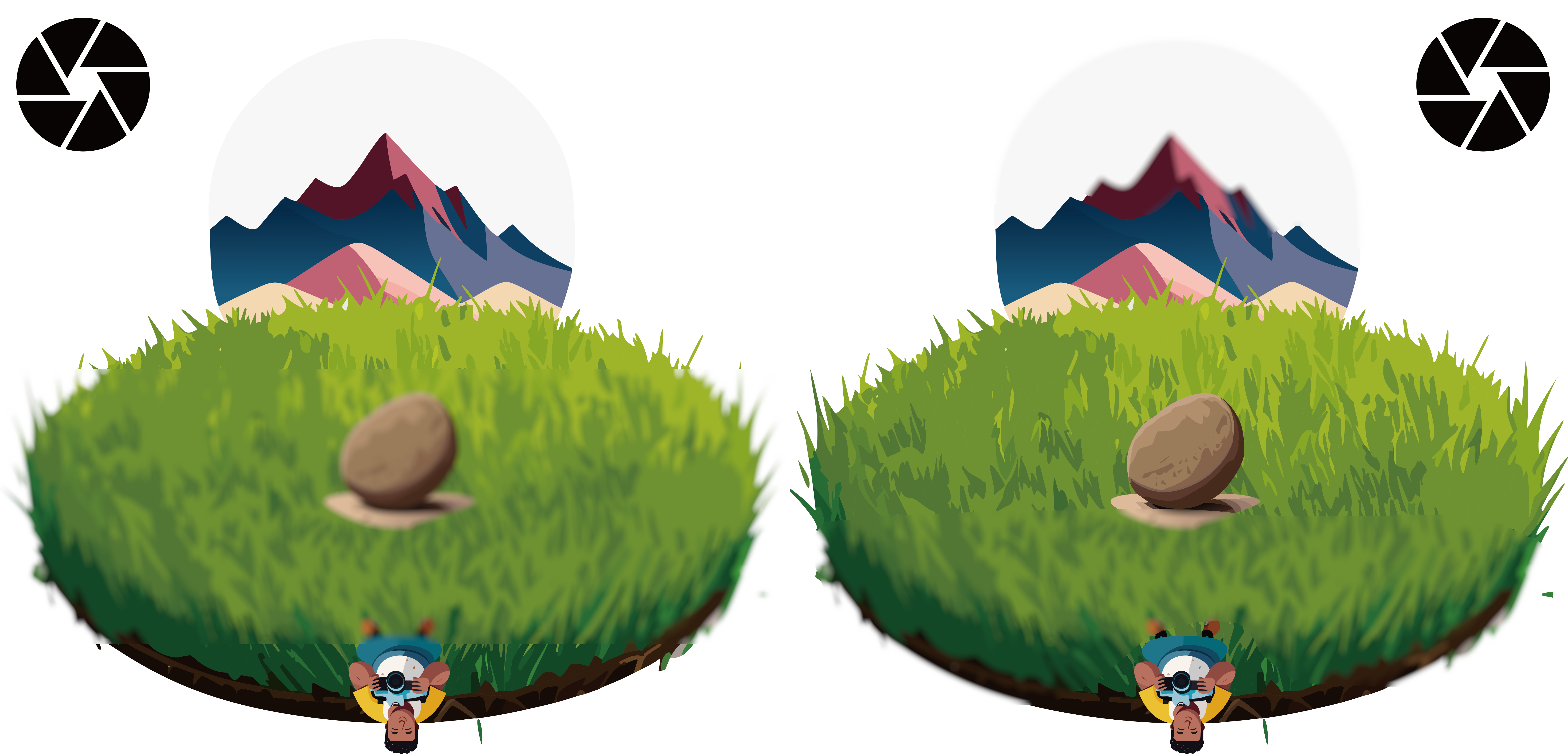 이 원리로 조리개 많이 열려있을 때 초점을 잡은곳이 나에게 먼 지점에 있는 산이라고 한다면, 실제로 피사계 심도에 의해 앞에 있는 돌은 선명하게 나오지 않죠.