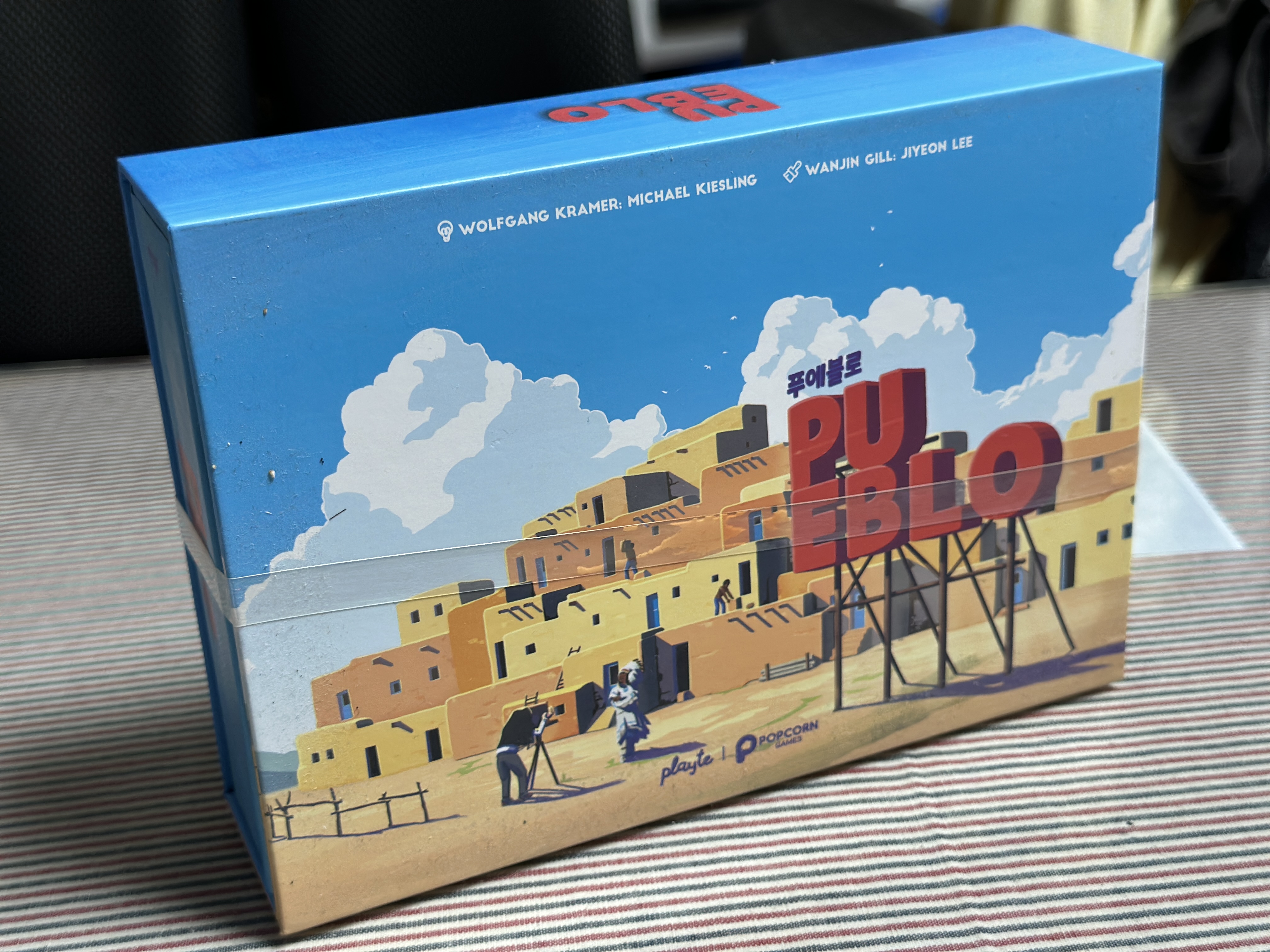 ‘푸에블로(Pueblo)’는 보드게임 디자이너 볼프강 크라머(Wolfgang Kramer)와 미하엘 키슬링(Michael Kiesling) 콤비가 만든 작품으로, 3D 구조물을 실제로 조립해나가는 방식의 시각적 추상 전략 게임이다. 플레이어는 각자 색깔이 있는 건축 블록과 중립 블록을 갖고 있으며, 게임판 위에 번갈아가며 이 블록들을 배치해 하나의 구조물(푸에블로)을 공동으로 세워나간다.